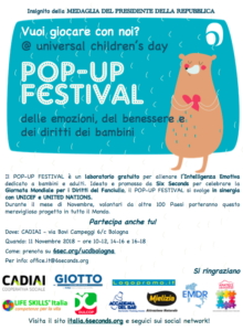 In Italia il POP-UP Festival, insignito della Medaglia del Presidente della Repubblica, durante tutto il mese di Novembre raggiungerà decine di città arrivando domenica 11 Novembre anche Bologna, ospite di CADIAI – Cooperativa Sociale presso la sede direzionale di Via Bovi Campeggi 6/c, ove saranno allestiti per tutta la giornata laboratori paralleli, differenziati per fascia di età e per area tematica (consapevolezza di sé, relazioni con gli altri, cambiamento), gestiti da trainer qualificati e che guideranno i partecipanti nell’esplorazione delle emozioni e nell’allenamento della propria intelligenza emotiva.