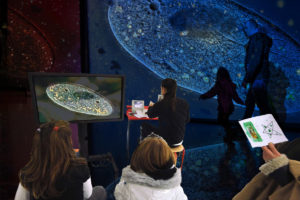 Il visitatore osserva il micro mondo di una goccia d’acqua e lo espande come la mappa di un mondo più vasto, in un’esperienza artistica e visuale nella quale le entità biologiche prendono forme, colori e suoni generati digitalmente in maniera parzialmente inaspettata. Obiettivo delle attività proposte è avvicinare i giovani all’osservazione scientifica utilizzando in modo inconsueto gli strumenti della ricerca per stimolare e liberare creatività e immaginazione.
