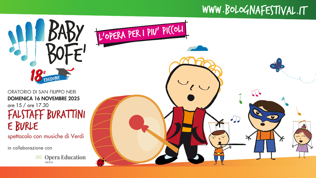Domenica 16 novembre ( ore 15 / ore 17.30) con lo spettacolo Falstaff – burattini e burle Baby BoFe’ si sposta in uno degli spazi teatrali più belli di Bologna, lo storico Oratorio di San Filippo Neri, in via Manzoni 5. In questo libero adattamento della celebre opera di Verdi, entreremo in un mondo popolato di maschere, burattini e marionette, in un clima di spensierata e allegra comicità.